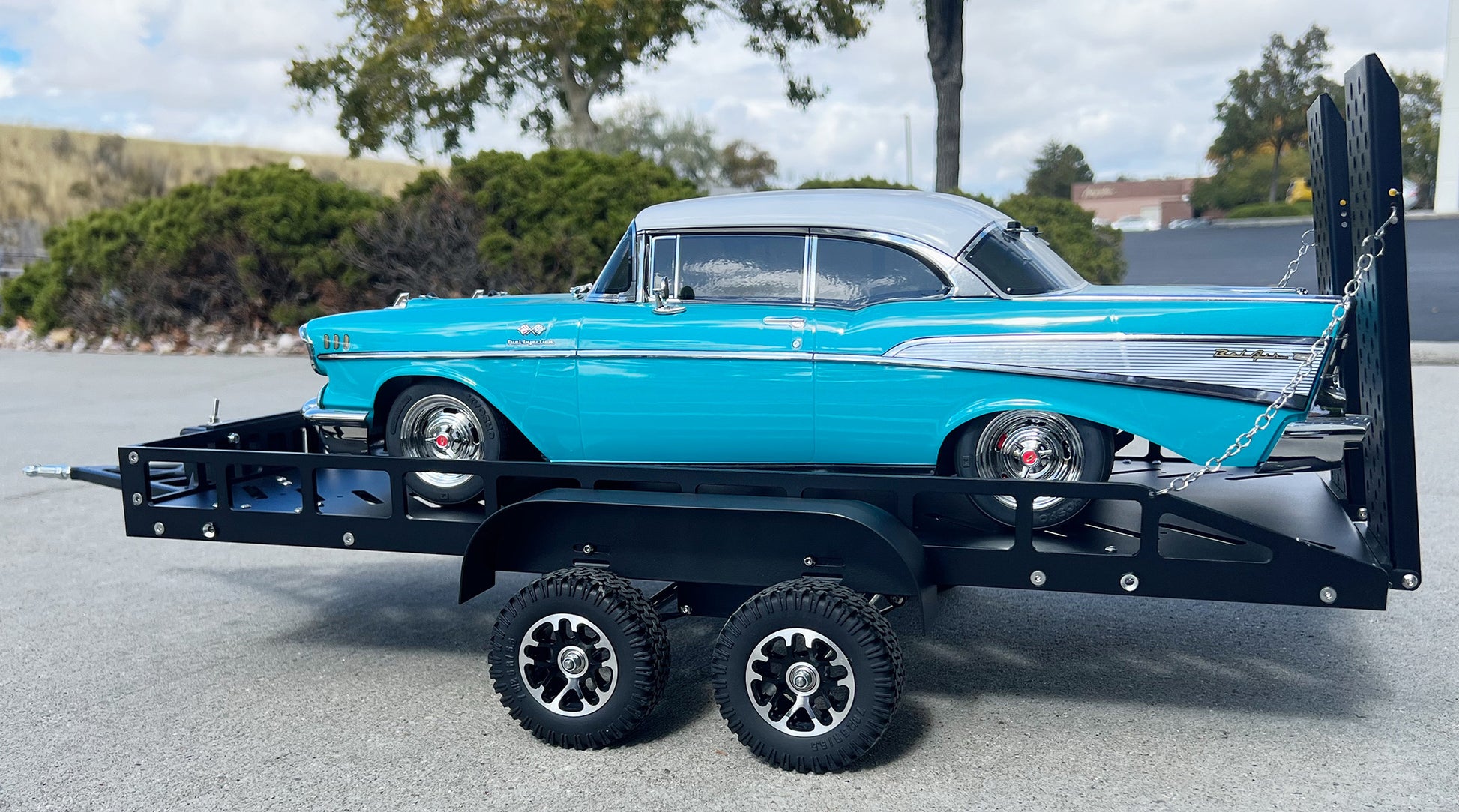 This trailer is built to 1/10 scale with utmost attention to detail. Every component, from the chassis to the wheels, is made from high-quality, durable metal, ensuring longevity and durability. The sleek Black finish on this trailer looks impressive and helps protect against scratches and wear. Equipped with bright LED lights, this trailer brings your RC adventures to life by providing illumination for both daytime and nighttime adventures, adding a touch of authenticity to your setup. The trailer is not just about looks. Designed for use, the trailer bed is spacious making it ideal for transporting miniature payloads or showcasing your favorite 1/10 scale vehicles. Attaching the trailer to your RC vehicle is a breeze, thanks to the user-friendly hitch mechanism. It securely locks in place, ensuring that your trailer stays attached while you navigate challenging terrain and obstacles.
