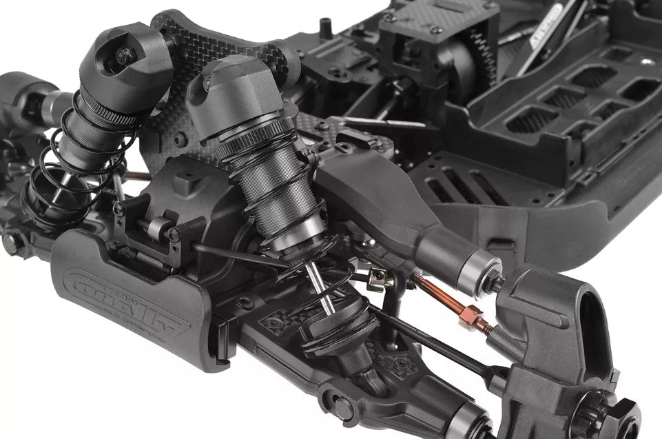 Graphite Shock Towers: Aerospace-grade carbon fiber provides exceptional rigidity and optimized mounting points for shock absorbers and camber links.