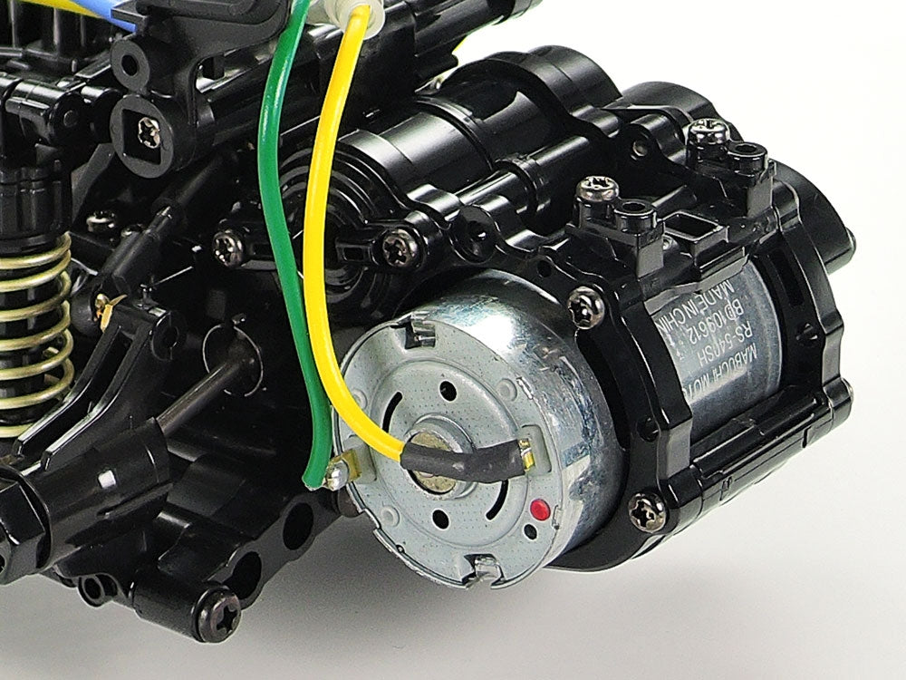 - The M-06 chassis features a rear-mounted motor, and a longitudinally-mounted battery pack with R/C units positioned on either side for optimum balance and a low center of gravity.