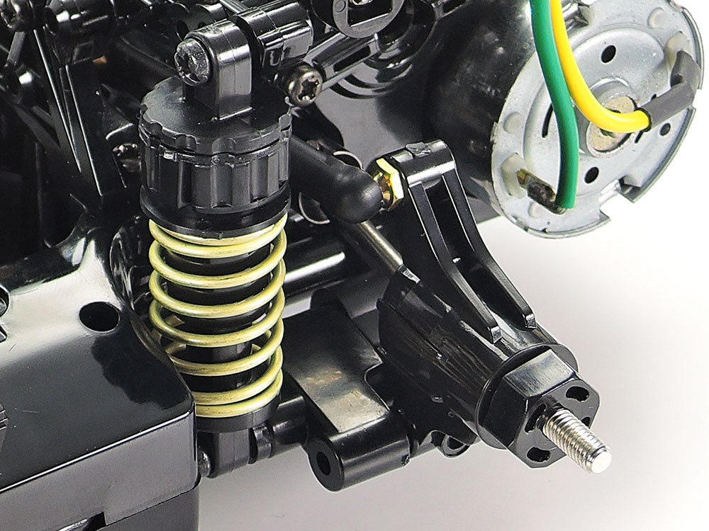 The M-06 chassis features a rear-mounted motor, rear-drive setup and features a longitudinally-mounted battery pack, with R/C equipment positioned on either side for optimum balance and a low center of gravity. 4-wheel double wishbone suspension uses metal-plated wheels, equipped with 60D radial tires at the front and 60D super grip tires at the rear. In addition, a 3-piece steering linkage offers nimble handling response. A large bumper is included.
