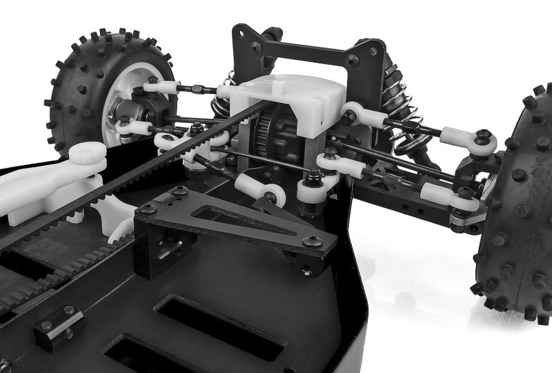 - Aluminum bulkhead, motor mount, rear hubs, and steering knuckles